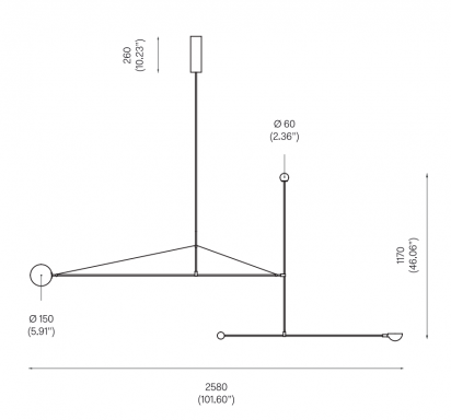 h 1270 – 2744 mm | ø 2580 mm *Bitte geben Sie bei der Bestellung die gewünschte Länge der Leuchte an, gemessen von der Decke bis zur unteren Befestigung.